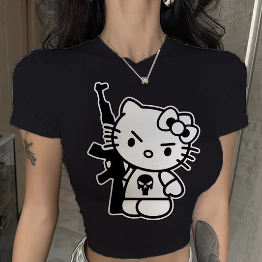 Hello Kitty Cute Print Crop Top Basic Casual Crewneck Short Sleeve T-Shirt Women Harajuku Slim Tees Vintage Fashion Y2K Outfits